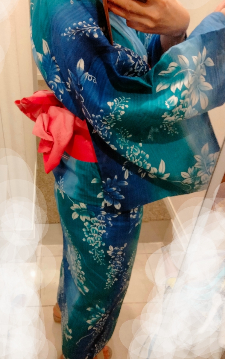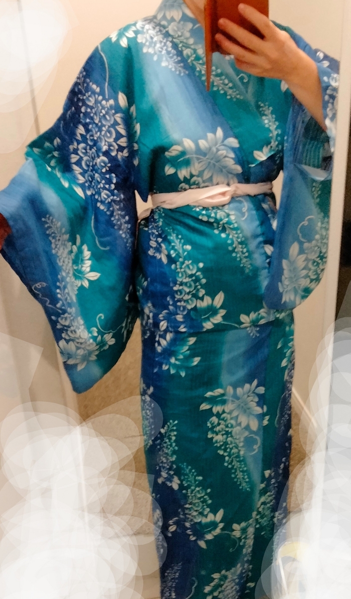 今回は青地に藤の花、青味がかったグリーンの入った浴衣!