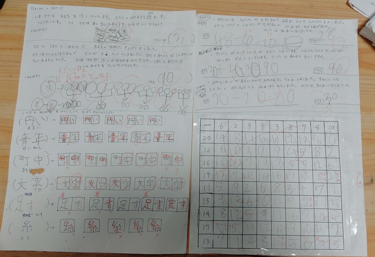国語プリントの丸付けを母がちゃちゃっとしてる間に、息子に算数プリントをやってもらう。