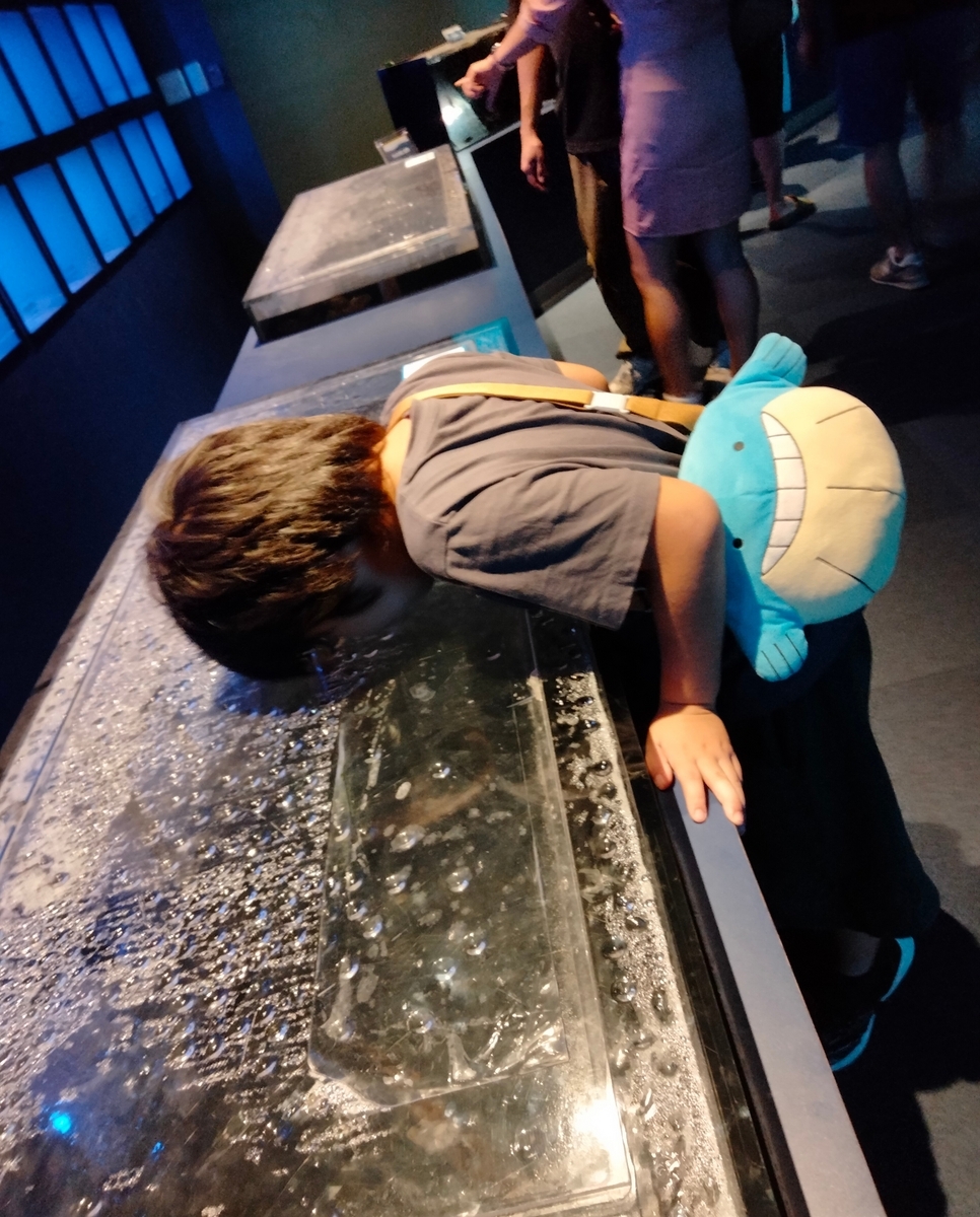 息子の好きなメガロドンの展示は無かったのですが、鮫の冷凍標本を触って「鮫肌」を知ったり、リュウグウノツカイの実物大の頭を見て大きさに驚いたり。(ポケモンのミロカロスのモデルになった深海魚だよ!と言っても今イチ響いていなかった...むぅ...)